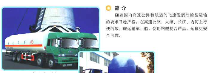 随着国内高速公路和航运的飞速发展危险品运输的要求日趋严格,在高速公路、大海、长江、内河上行驶的酸、碱运输车、船、使用钢塑复合产品,运输更安全可靠。